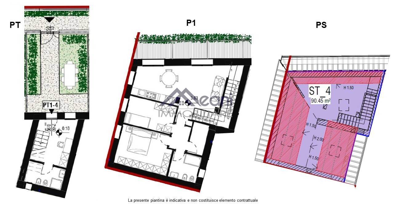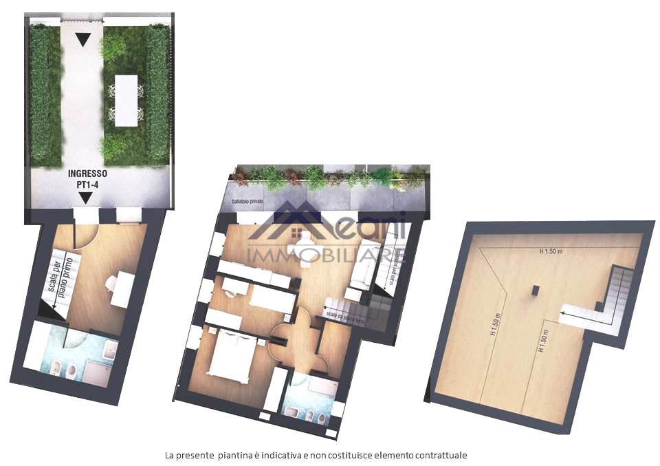 Piano 1: soggiorno con cucina a vista, camera matrimoniale, cameretta, secondo bagno, ripostiglio, balcone; collegato da scala interna troviamo il Piano Sottotetto.