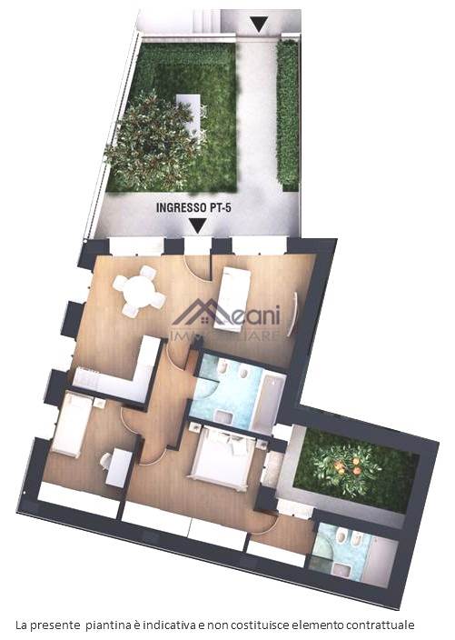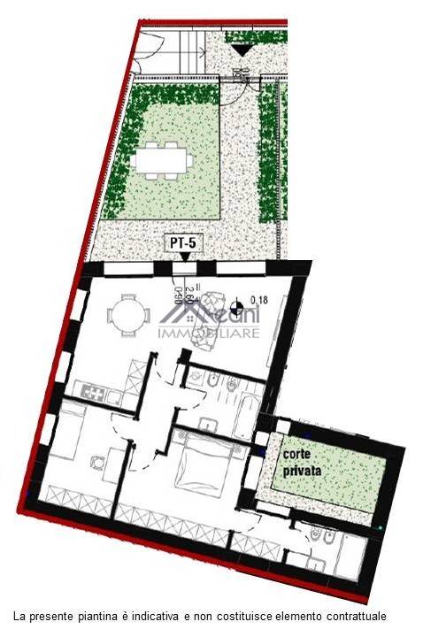 Composizione: giardino privato, ingresso, soggiorno, cucina, camera matrimoniale, cameretta, 2 bagni, giardino interno privato/corte privata.
